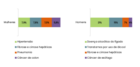 As principais causas de óbitos por uso de álcool na faixa etária de 55 anos ou mais anos variaram por sexo. Entre os homens, as principais causas estão a Doença alcoólica do fígado (21%), Transtornos por uso de álcool (15%), Fibrose e cirrose hepáticas (7%) e Câncer de colon (4%). Para as mulheres, as principais causas foram Hipertensão (7,9%), Fibrose e cirrose hepáticas (7,8%), Pneumonia (7,0%) e Câncer de colon (5,8%). Outras causas de óbito citadas incluem Fibrose e cirrose hepáticas e Câncer de esôfago.